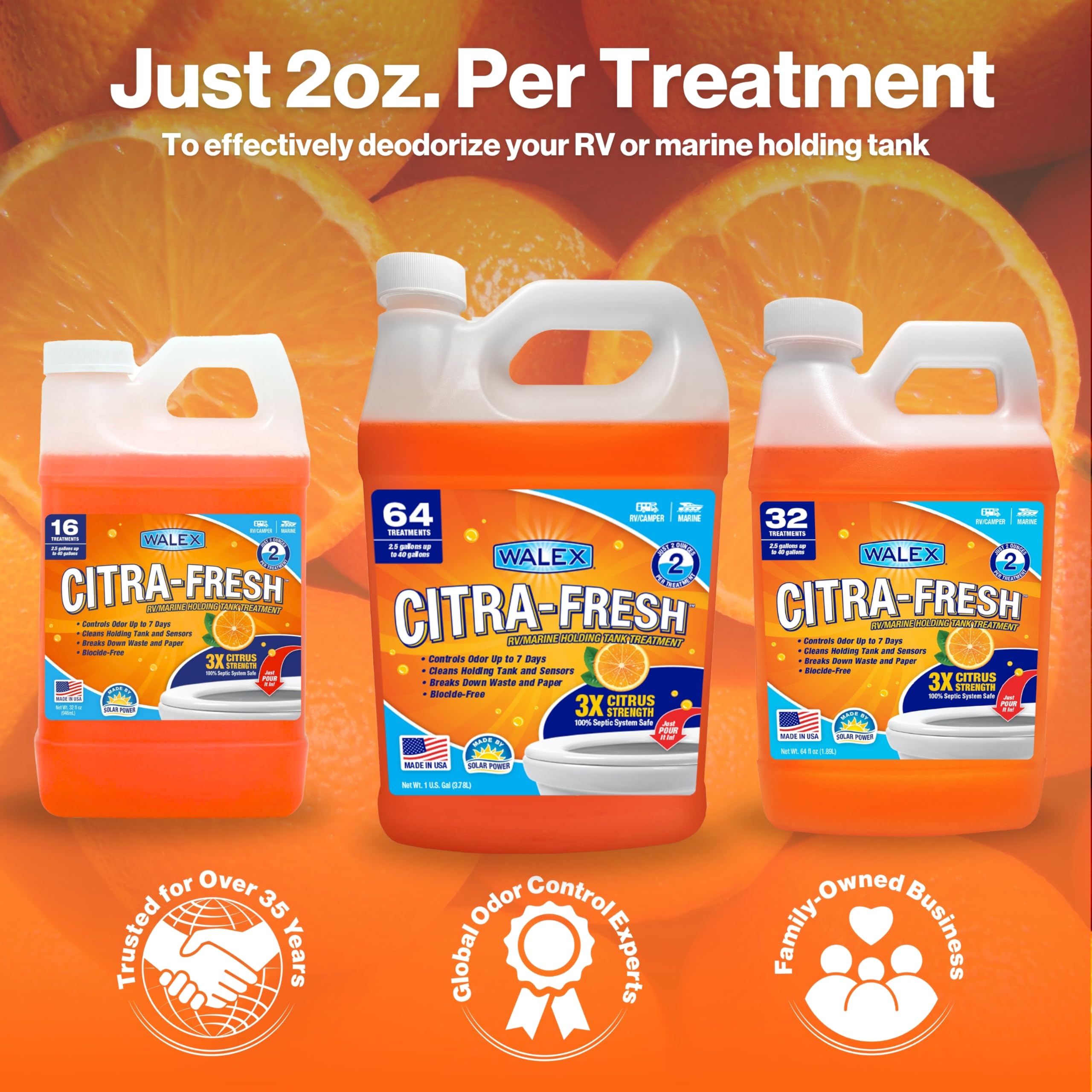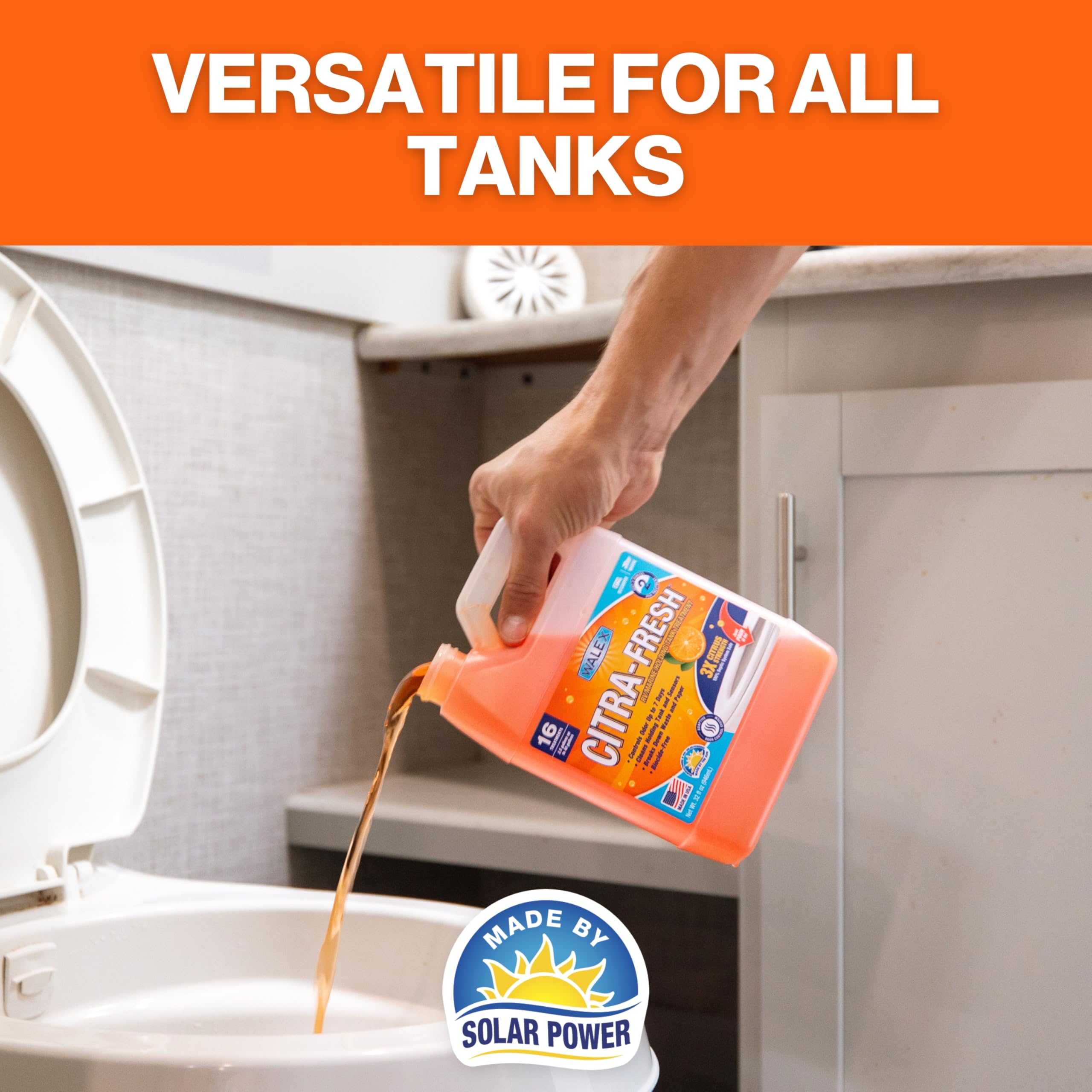 Walex Products Citra-Fresh is a powerful liquid holding tank treatment designed specifically for RV, camper, and marine black water tanks. This citrus-infused formula starts working immediately to control odors while rapidly breaking down waste and toilet paper for hassle-free tank maintenance.