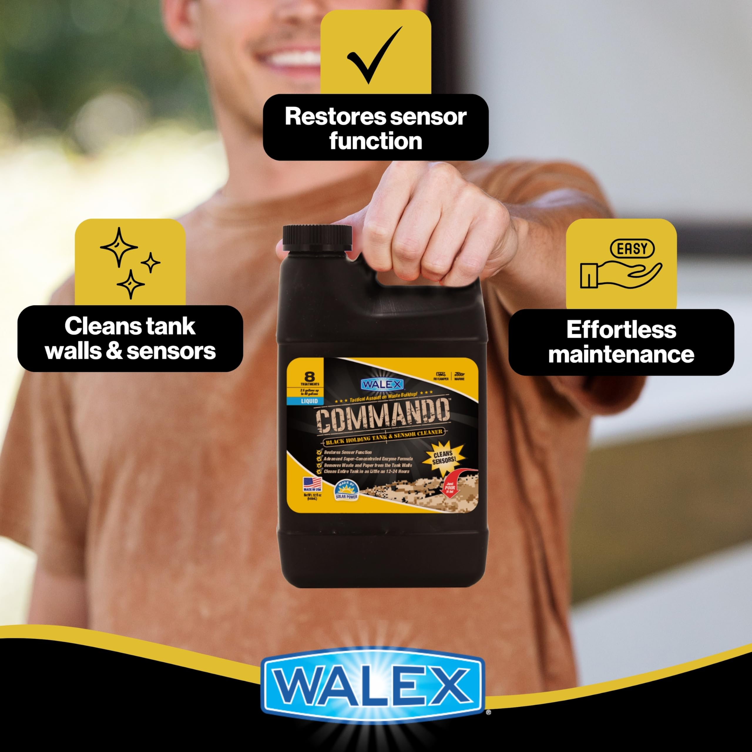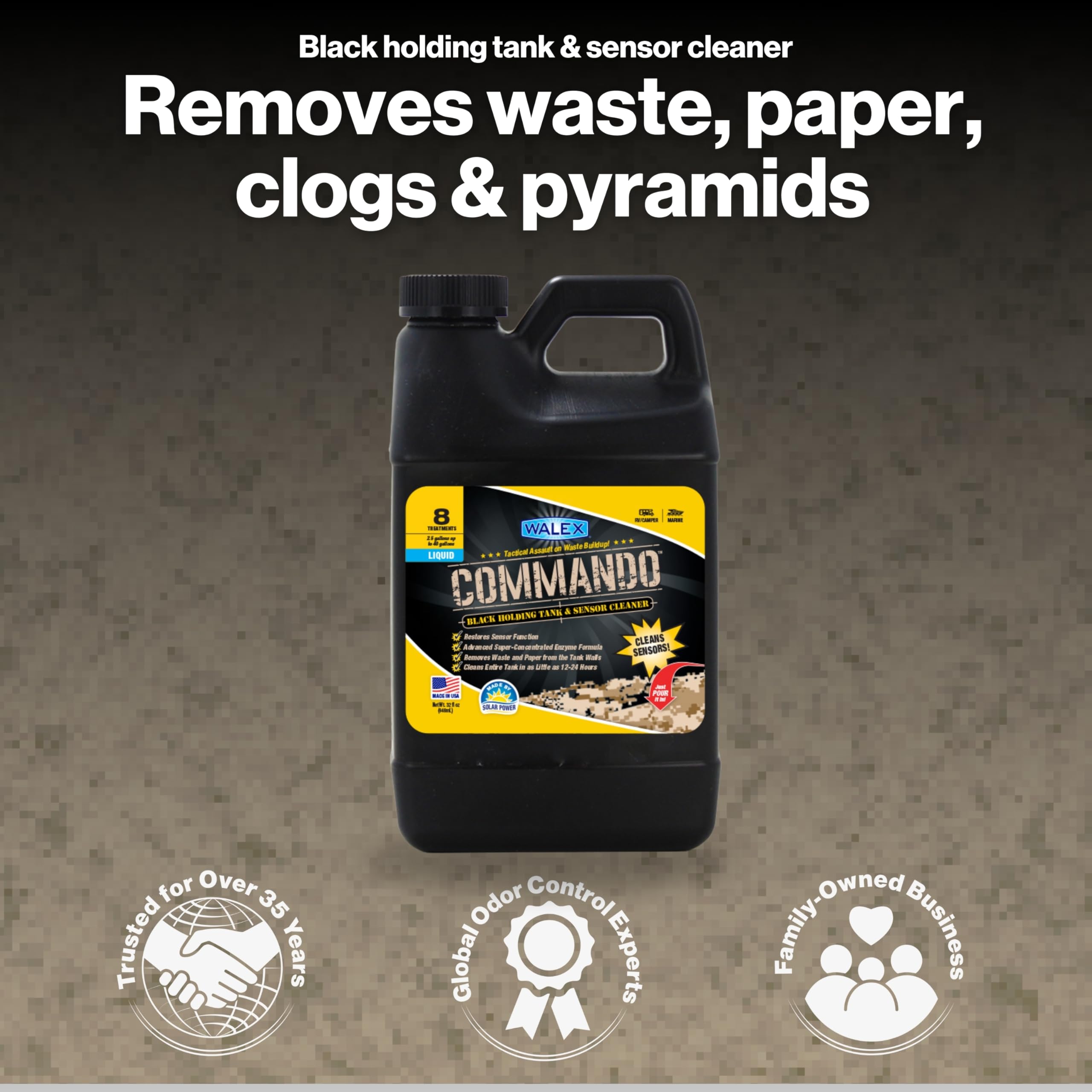 The Walex Commando Liquid Black Holding Tank and Sensor Cleaner is a super-concentrated, enzyme-powered formula designed to deep clean RV, camper, and marine black water holding tanks. This professional-strength cleaner tackles the toughest buildup, waste residue, and stubborn deposits that cause sensor malfunctions and unpleasant odors.