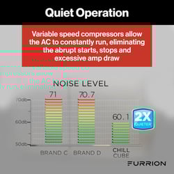 The Furrion Chill Cube 18K BTU Ducted Roof Air Conditioner delivers exceptional cooling performance for RVs in all climate conditions. This advanced inverter-driven system features variable speed compressor technology that automatically adjusts to environmental conditions, providing 50% greater efficiency compared to traditional RV air conditioners while maintaining whisper-quiet operation.