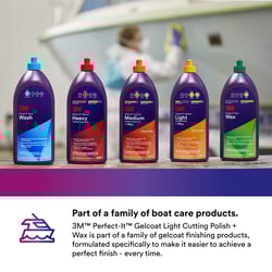 The 3M Perfect-It Gelcoat Light Cutting Polish + Wax is formulated to quickly remove light to medium oxidation, light scratches, swirl marks and other minor defects from gelcoat. This polish removes scratches of P1500 or finer, and leaves a polished wax finish without swirls even in difficult dark-colored gelcoats.