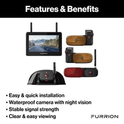 The Furrion Vision S+ is a comprehensive wireless backup camera system designed for RVs and large vehicles, providing enhanced safety and visibility while driving and parking. This complete package includes a 7-inch touchscreen monitor, side camera pair, rear camera, and sharkfin camera for customizable multi-angle viewing.