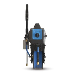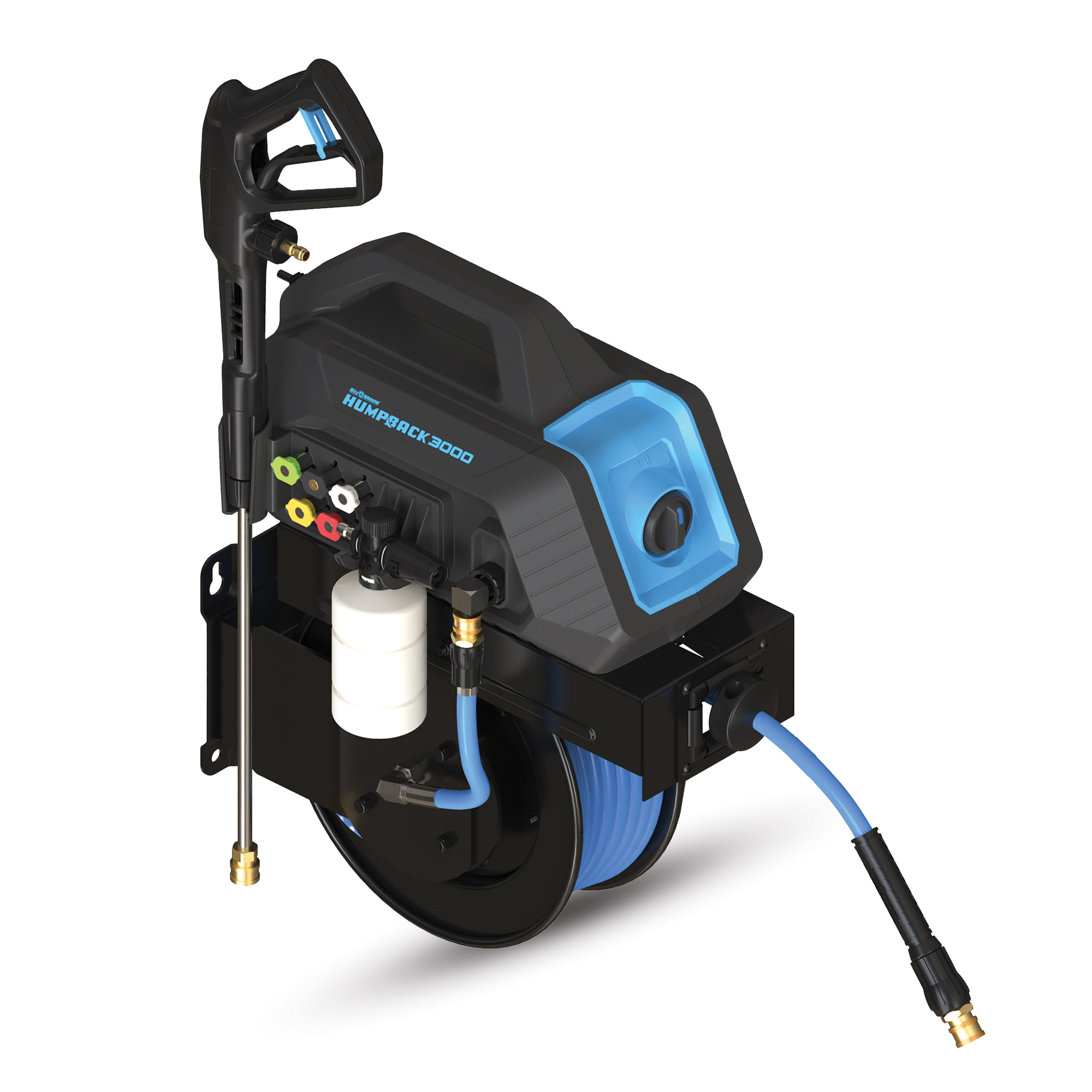 The Blushield HumpBack Pressure Washer System combines a wall-mounted hose reel with an integrated 3000 PSI electric pressure washer, creating a compact, space-saving solution that eliminates the need for a traditional floor-standing unit. Engineered by BluBird Industries, this innovative design features a durable steel frame with dual-arm construction for maximum stability during operation.