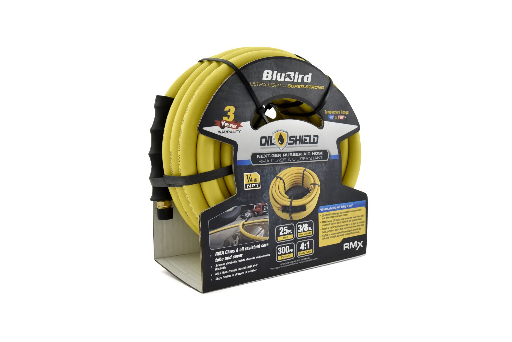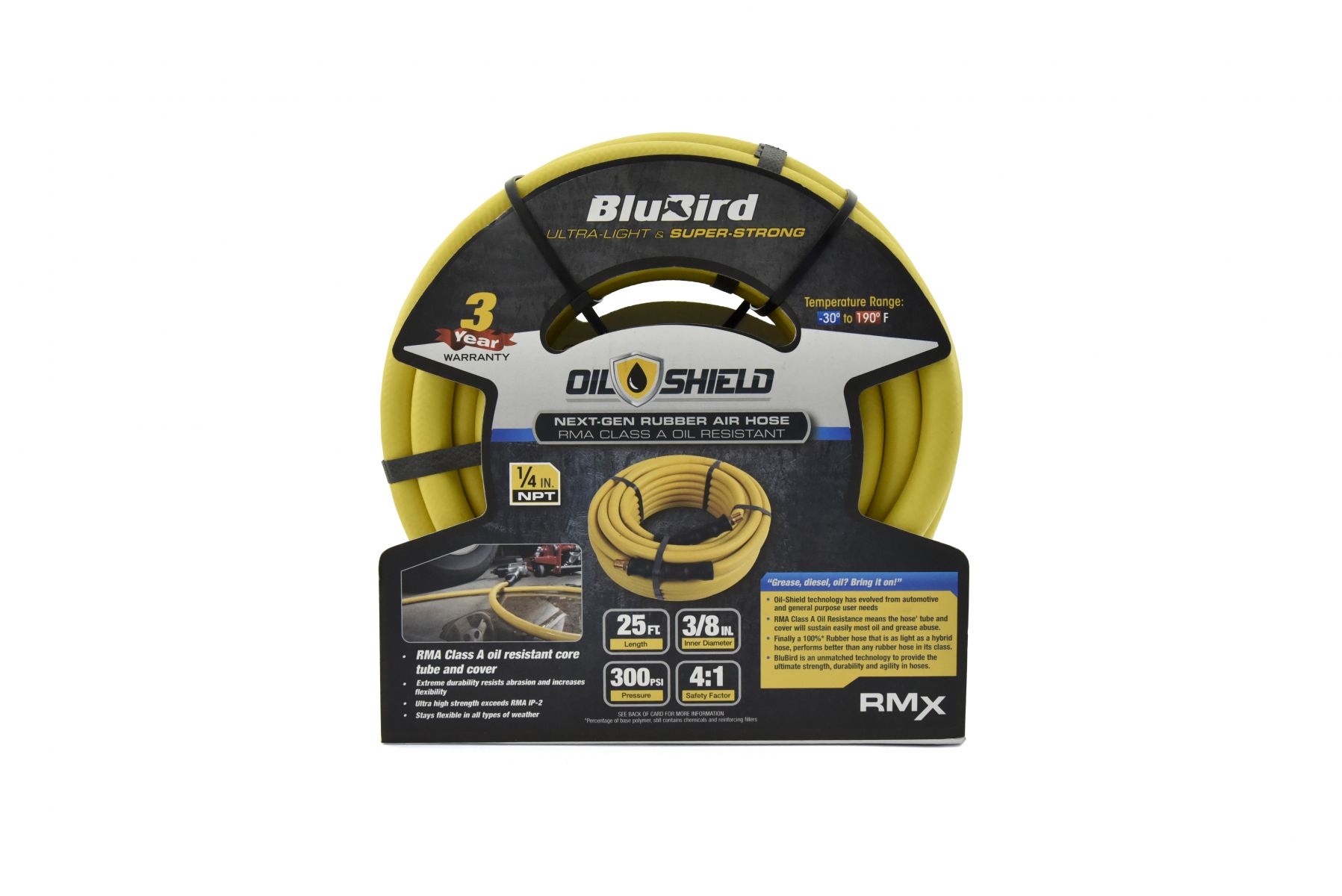 The OilShield OS3825 is a premium RMA Class A oil-resistant rubber air hose designed for demanding professional environments. This 3/8" x 25' hose features 100% rubber construction with a Nitrile core and cover, providing exceptional resistance to oils, diesel fuel, gasoline, and common cleaning agents found in shop and garage settings.
