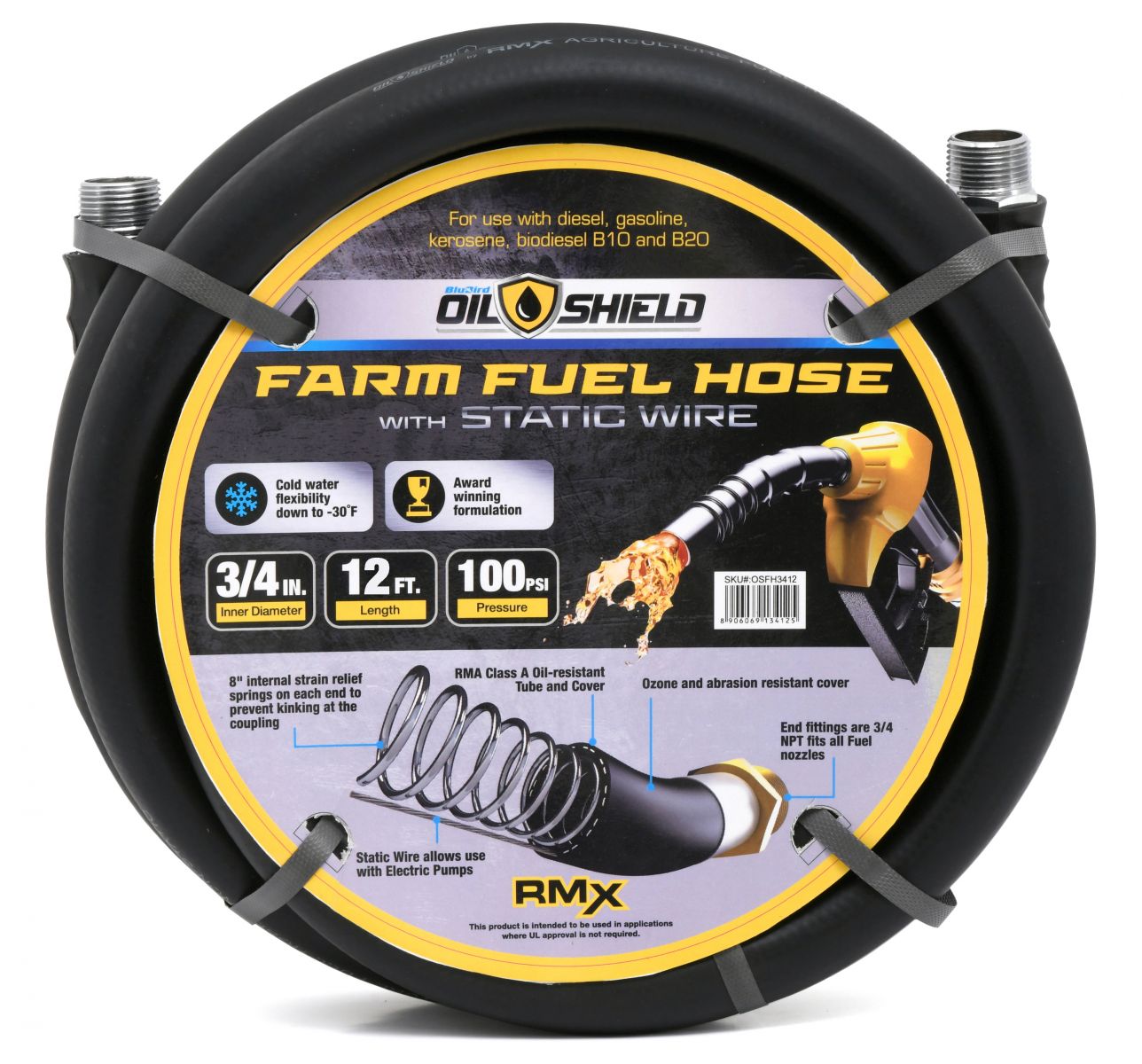 The OilShield OSFH3412 is a professional-grade 3/4-inch diameter rubber fuel transfer hose designed specifically for agricultural and farm applications. This 12-foot assembly features integrated static wire for safe fuel handling and is engineered for use with 110-volt electric pumps, making it ideal for refueling farm equipment, trucks, trailers, and service vehicles.