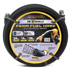 The OilShield OSFH3414 is a heavy-duty 3/4-inch diameter rubber fuel transfer hose designed specifically for agricultural and farm applications. This 14-foot assembly features integrated static wire for safe fuel transfer and is engineered for use with 110-volt electric pumps, making it ideal for refueling farm equipment, trucks, trailers, and service vehicles.