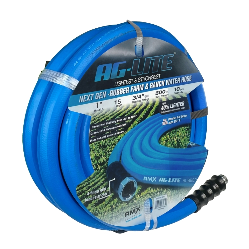 The AG-Lite ALONE15 is a heavy-duty rubber water hose assembly designed for agricultural and industrial applications. This 1-inch diameter hose extends 15 feet, making it ideal for bridging gaps between existing hoses or extending your reach for watering and fluid transfer tasks.