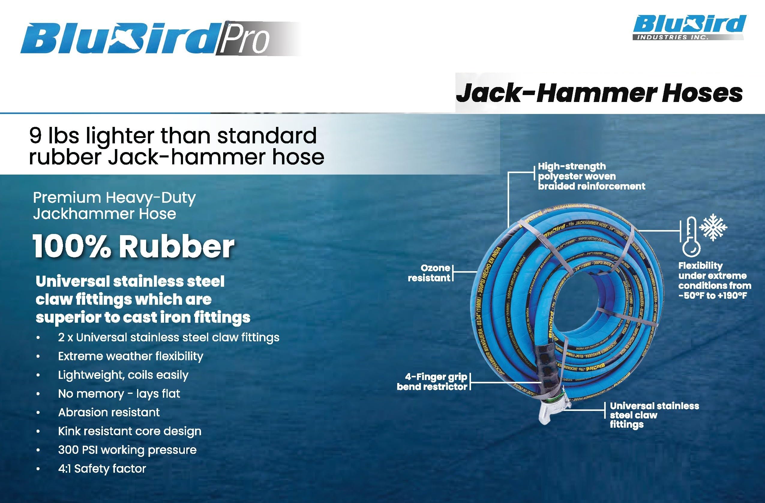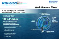 The BluBird Pro BBPROJH34100 is a heavy-duty rubber jack hammer air hose designed for demanding construction and demolition applications. This professional-grade hose features 100% rubber construction with high-strength polyester woven braided reinforcement, delivering exceptional durability while remaining lighter and more flexible than conventional industrial hoses.