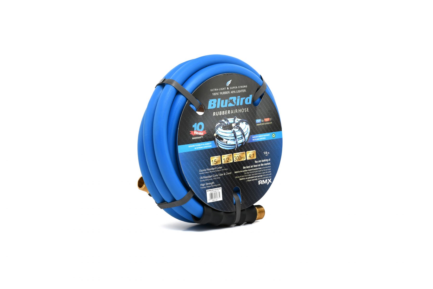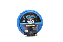 The BluBird BB1215 is a professional-grade rubber air hose assembly featuring a 1/2" inner diameter and 15-foot length, designed for reliable compressed air delivery in workshop and jobsite applications. This lightweight hose delivers superior performance with a 40% weight reduction compared to standard rubber air hoses, making it easier to maneuver and reducing operator fatigue during extended use.
