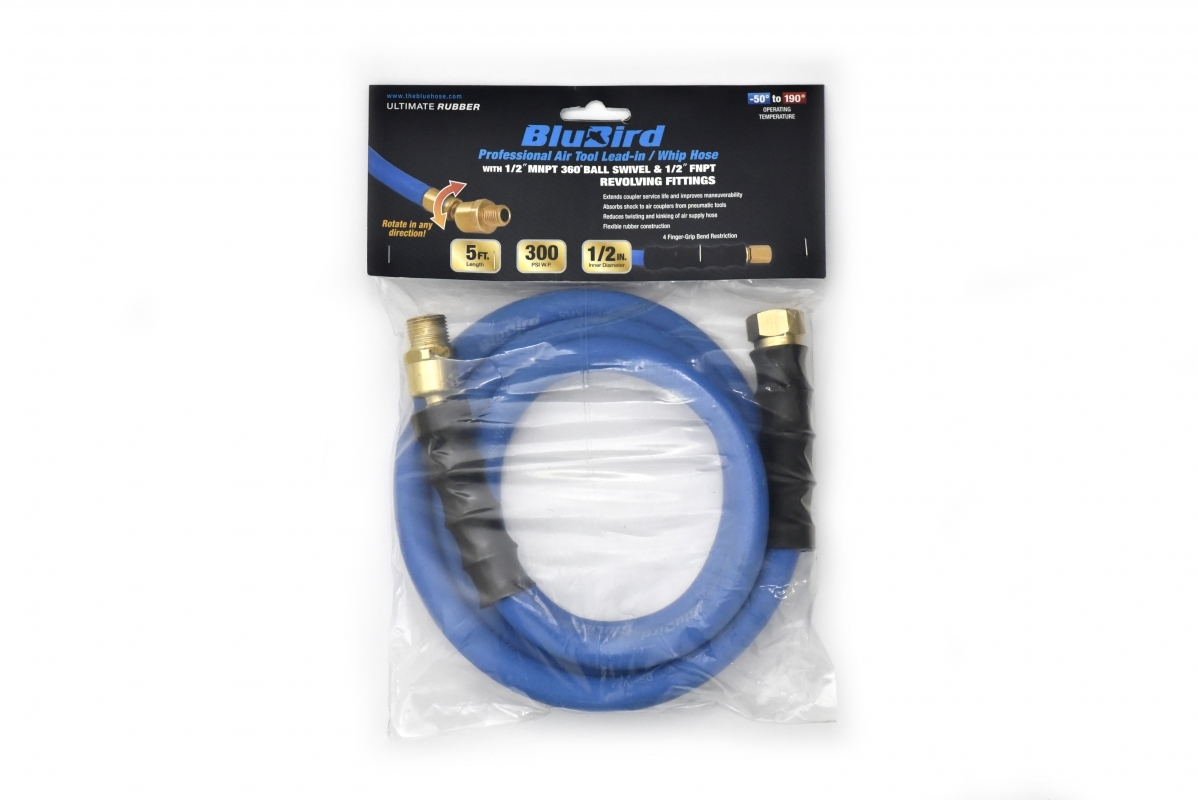 The BluBird BBSR1205 is a heavy-duty rubber air hose whip designed to improve workplace safety and efficiency. This 1/2-inch diameter by 5-foot length snubber hose serves as a flexible connection between your main air supply line and pneumatic tools, keeping the heavier supply hose on the ground and reducing tripping hazards in your work area.