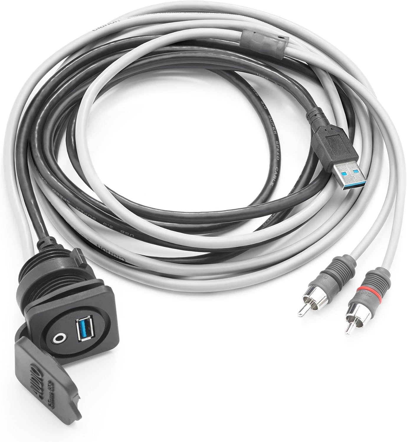 This panel-mount combination jack is ideal for boats, RVs, motorcycles, and other applications where you need reliable audio and USB connectivity in exposed conditions. Note: An appropriate USB cable for your device is required to make the input connection.