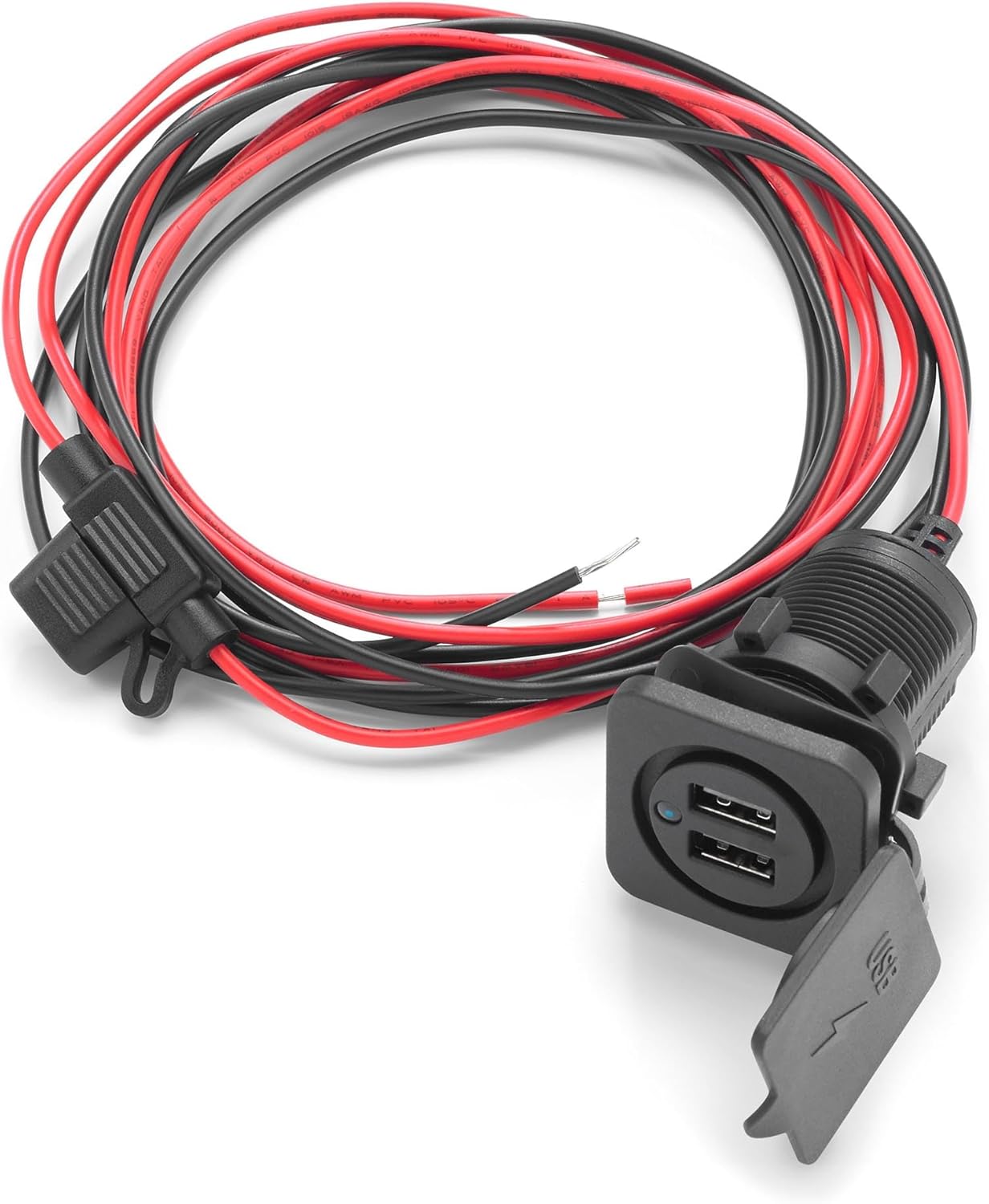 This panel-mount charging solution is perfect for creating a clean, professional installation on boats, ATVs, UTVs, motorcycles, RVs, and custom automotive applications. The labeled rubber cover protects the USB ports when not in use, ensuring long-lasting performance even in outdoor environments.