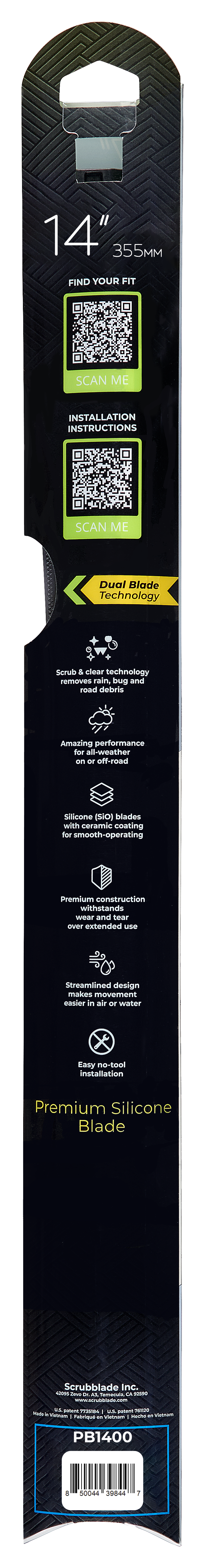 The Scrubblade PB1400 Black Edition is a premium 14-inch (350mm) silicone wiper blade engineered for superior performance and longevity. Unlike traditional rubber wiper blades that degrade quickly, this blade features a 100% silicone construction that delivers exceptional durability and consistent wiping performance.