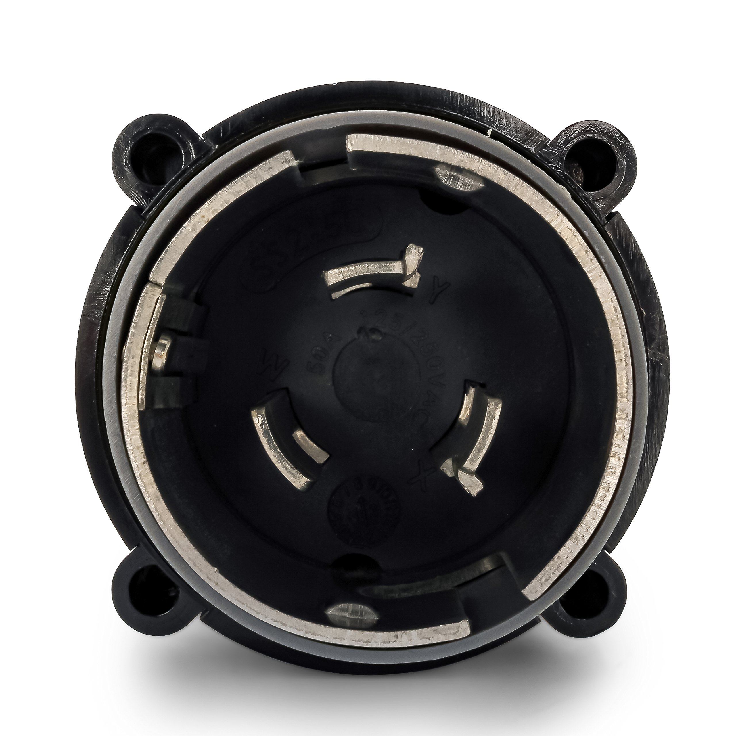 • 50-amp 125/250V male locking plug to 30-amp 125V female locking connector