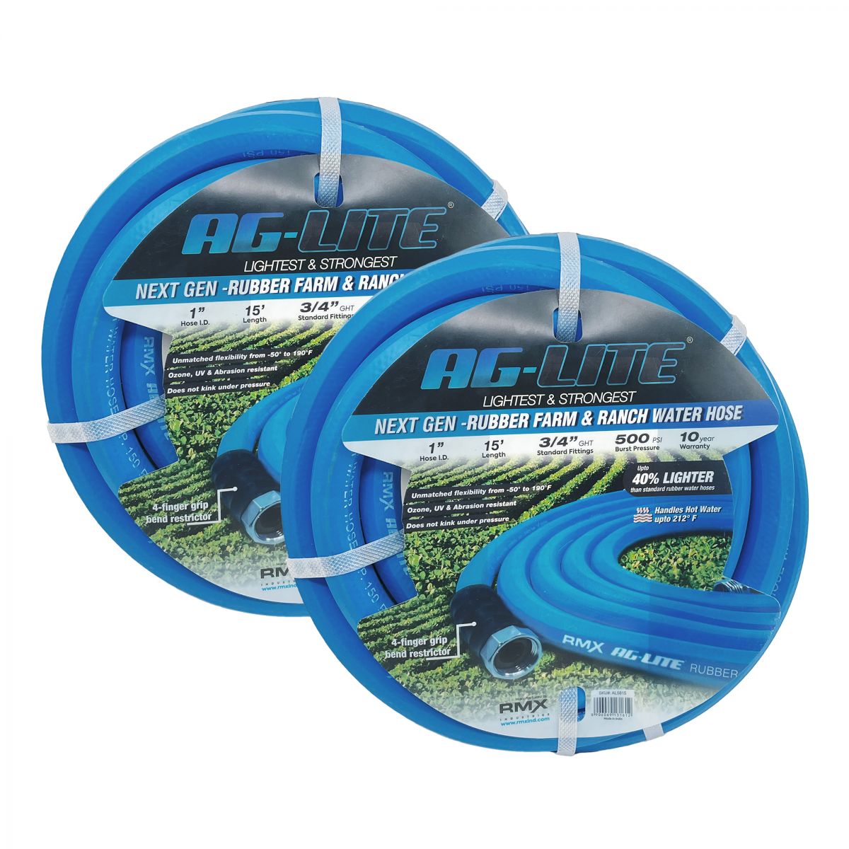 The AG-Lite ALONE15-2pk Premium Rubber Water Lead-In Hose delivers professional-grade performance for agricultural, industrial, and commercial water delivery applications. This convenient 2-pack includes two 15-foot hoses constructed from 100% premium rubber for exceptional durability and flexibility in demanding environments. Each hose features a 1-inch internal diameter for high-volume water flow, terminated with 3/4-inch male and female GHT (Garden Hose Thread) fittings for universal compatibility with standard water connections.