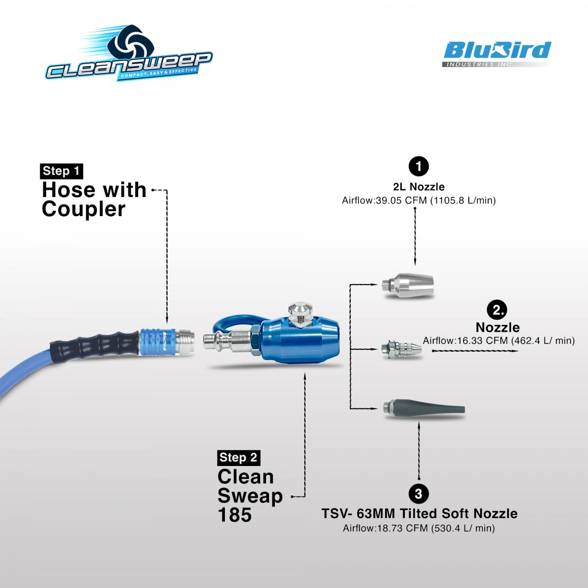 The BluBird CS185-2 Clean Sweep Mini Air Blow Gun Kit is a compact, high-performance compressed air tool designed for precision cleaning and versatile air delivery applications. This professional-grade kit includes the CS185 mini air blow gun with two specialized nozzles and a thumb safety valve (TSV) for enhanced control and safety during operation.