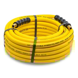 This hose assembly is ideal for use with pneumatic tools in service bays, garages, manufacturing facilities, fabrication shops, and tire service centers. The solid brass fittings ensure long-lasting performance and corrosion resistance, while the bend restrictor provides superior control and extends hose life by preventing damage at connection points. The hybrid material construction offers excellent resistance to oils, chemicals, and UV exposure, making it suitable for both indoor and outdoor applications in professional environments.