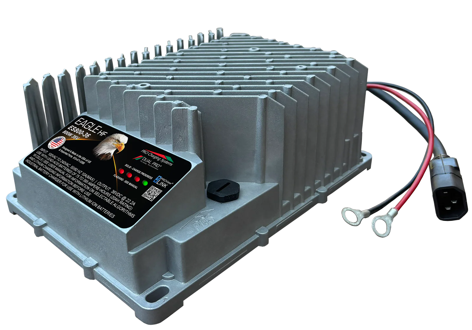 The Dual Pro Eagle HF ES800 Series 36V battery charger delivers 800 watts of charging power for demanding marine, industrial, and commercial applications. This advanced onboard charger is specifically designed for 36-volt battery systems and features universal AC input compatibility (85-270 VAC 50/60Hz) for use worldwide.