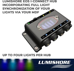 The Lumishore EOS i-Connect Hub is an advanced junction box designed specifically for easy installation and control of Lumishore EOS series underwater lighting systems. This essential component serves as the central control hub for connecting and synchronizing multiple EOS underwater lights on your vessel.