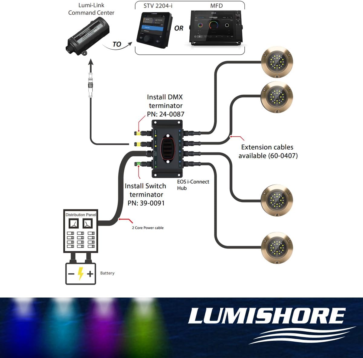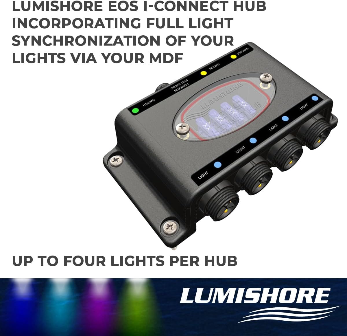 The i-Connect Hub provides the foundation for a professional-grade underwater lighting system, enabling you to create custom lighting scenes and control your EOS lights through compatible multifunction displays, smartphones, or dedicated Lumishore controllers. Designed for marine environments, this hub simplifies wiring while providing robust performance and expandability for vessels of all sizes.