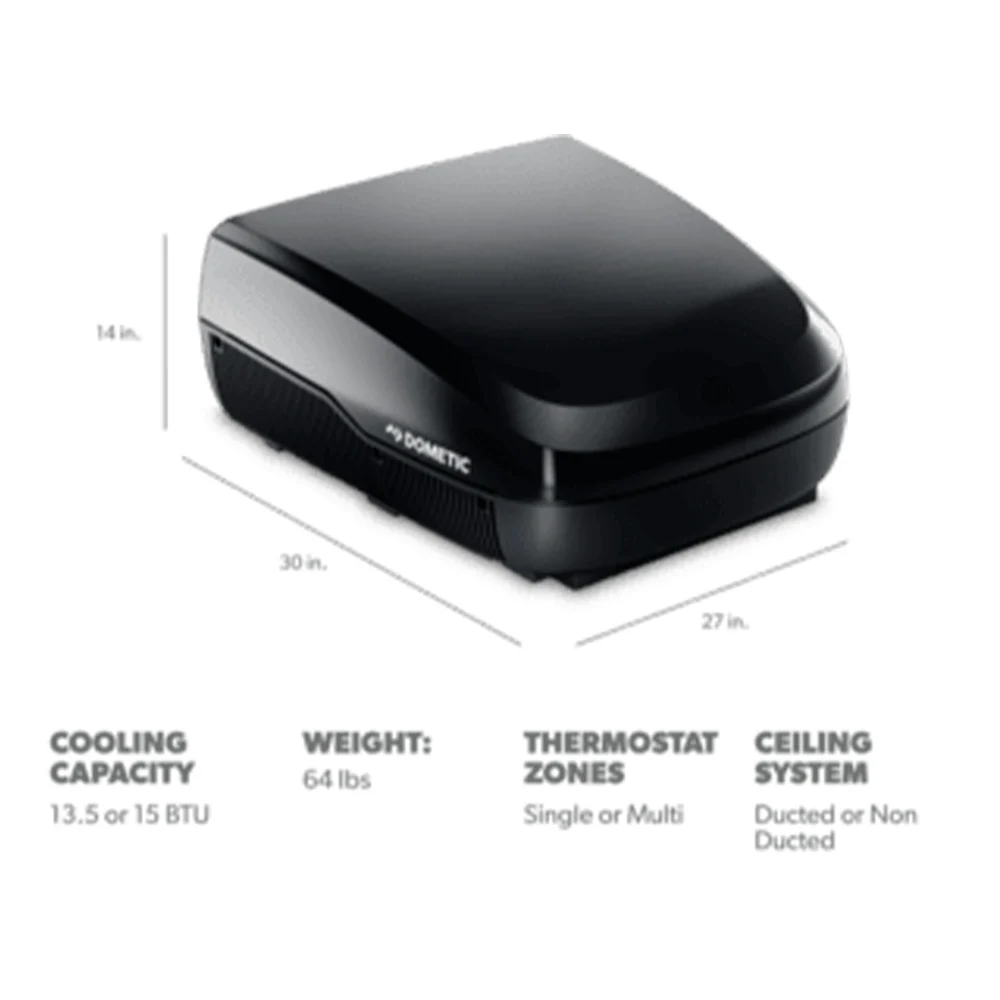 The Dometic FreshJet 3 Series rooftop air conditioner delivers powerful 15,000 BTU cooling performance with enhanced efficiency and modern design. This standard profile RV air conditioner features an innovative custom blower system that provides superior airflow and cooling capacity while operating up to 4 decibels quieter than previous models for more restful sleep.