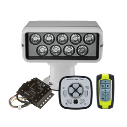 The ACR RCL-50 LED Searchlight is engineered for small-to-mid-size pleasure crafts and commercial vessels, featuring a rugged die-cast aluminum housing with ultra-bright 6 LED lamp technology delivering over 100,000 candela power. This complete kit (part number 1980) includes the white RCL-50 LED searchlight along with the next-generation control system: URP-103 wired Point Pad, URC-104 Master Controller, and URH-103 wireless handheld remote control.