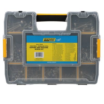 The Seachoice RP-KP9097SC is a comprehensive 1,008-piece stainless steel fastener kit designed specifically for marine applications. This extensive collection includes the most popular sizes of machine screws and self-tapping screws, along with corresponding hex nuts, locknuts, and flat washers for complete installation versatility.