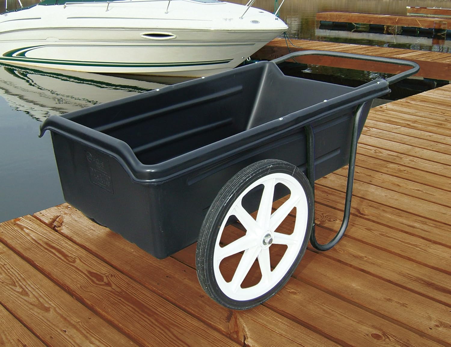 The flat-free tire design eliminates concerns about punctures from nails or sharp debris, while the curved handle and angled tub geometry make this cart exceptionally easy to push and pull. Built to withstand the rigors of the marine environment, the Dock Pro cart is also ideal for garden, landscape, and general cargo hauling applications.