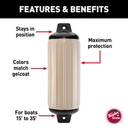 Taylor Made's Supergard series fenders are engineered to withstand harsh marine environments while providing excellent cushioning between your boat and docks, pilings, or other vessels. The distinctive ribbed pattern helps keep the fender in place while protecting your boat's finish from scratches and damage.