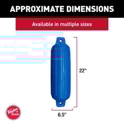 This 6.5" diameter x 22" length fender is constructed from tough marine-grade vinyl that withstands harsh marine elements. The Mid Atlantic Blue color is designed to match contemporary gelcoat colors used by many boat manufacturers, adding an attractive accent to your vessel. Ideal for boats in the 15-35 foot range.