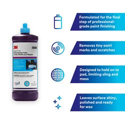This 32 fl oz (1 quart) bottle provides ample polish for multiple vehicles. Ideal for use with dual-action polishers or rotary buffers on clear coat and single-stage paint systems. The water-based formula cleans up easily and leaves minimal residue.