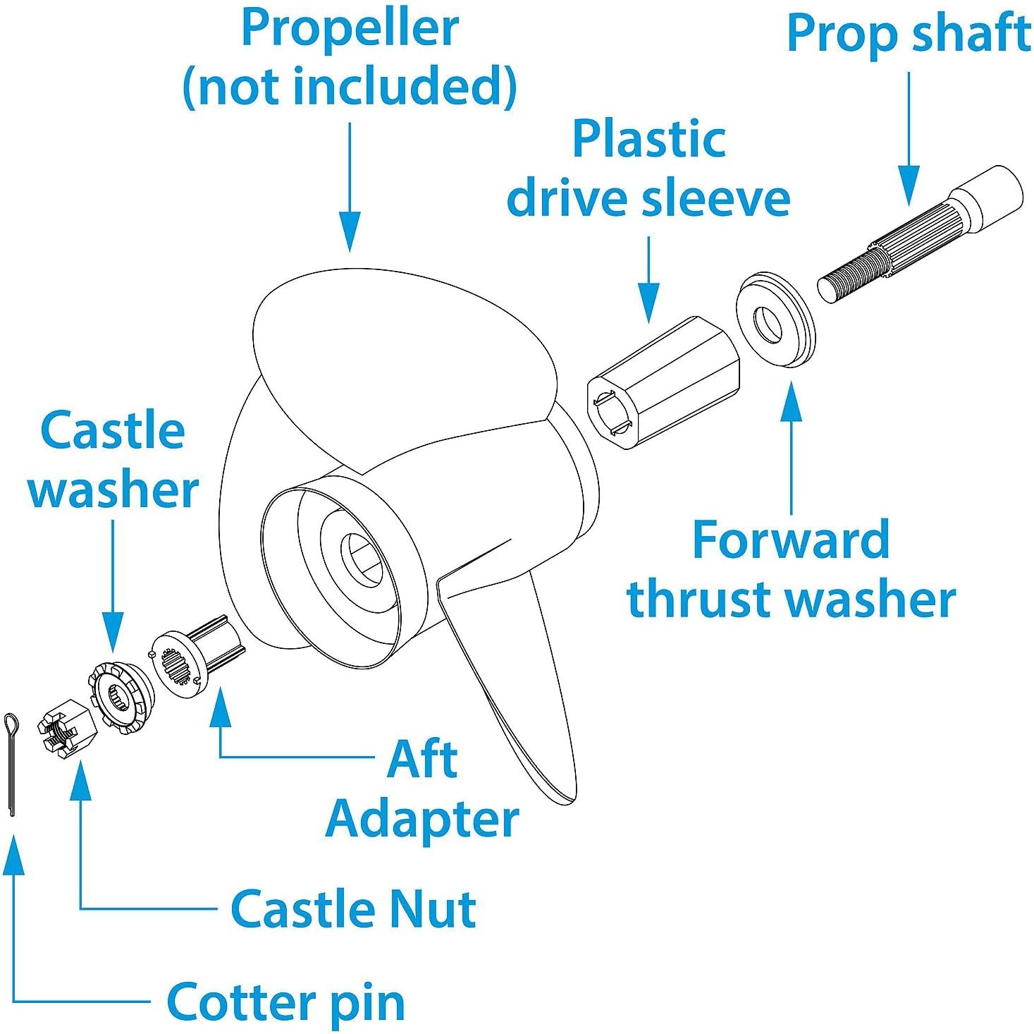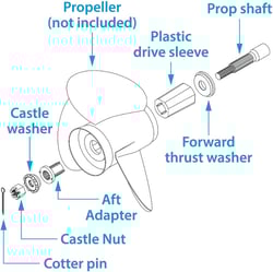 • Complete hub kit includes plastic drive sleeve, thrust washers, aft adapter, hardware, and cotter pin