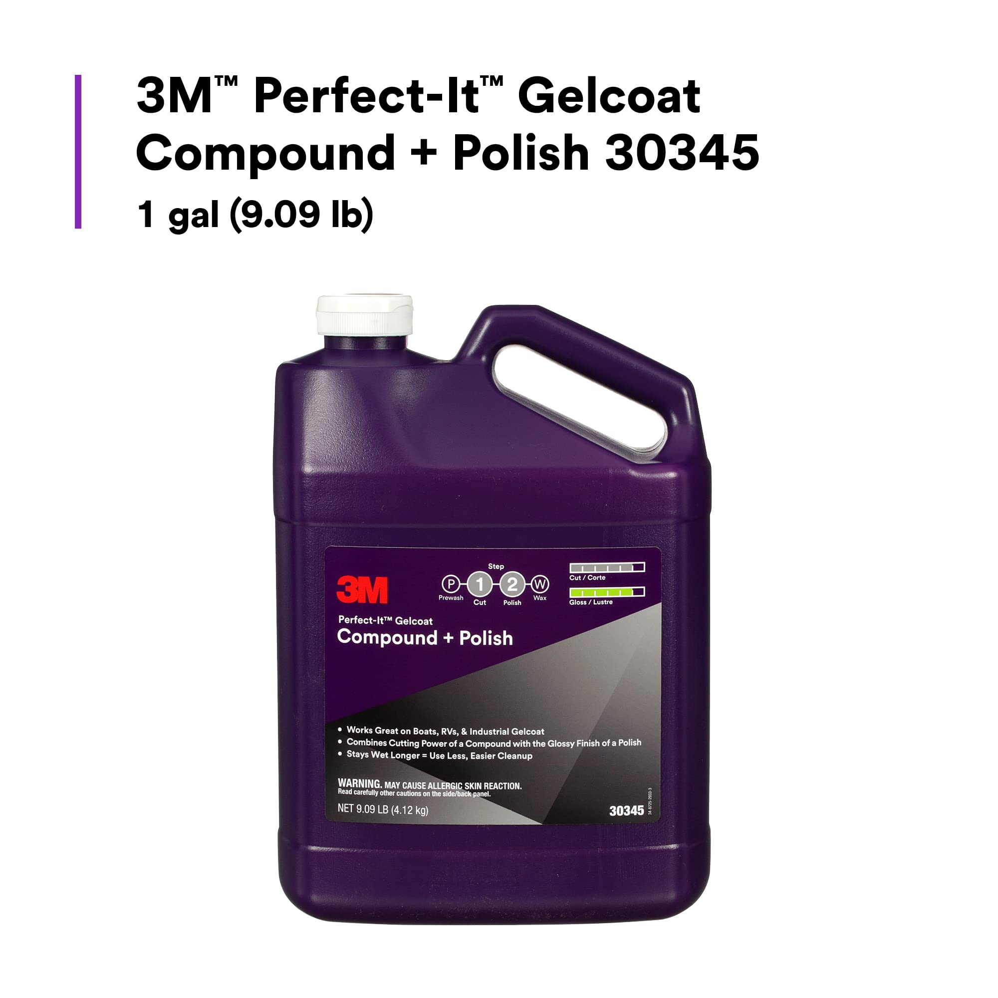 The 3M Perfect-It Gelcoat Compound + Polish is a professional-grade formula designed to be used as a single-step compound and polish or second-step finish for eliminating P1000 and finer scratches, scuff marks, and other surface blemishes from gelcoat surfaces including marine, RV, and industrial applications. This advanced formula removes P1000 and finer scratches while offering a high gloss and fine finish, even on darker colored gelcoat, reducing time and expense.