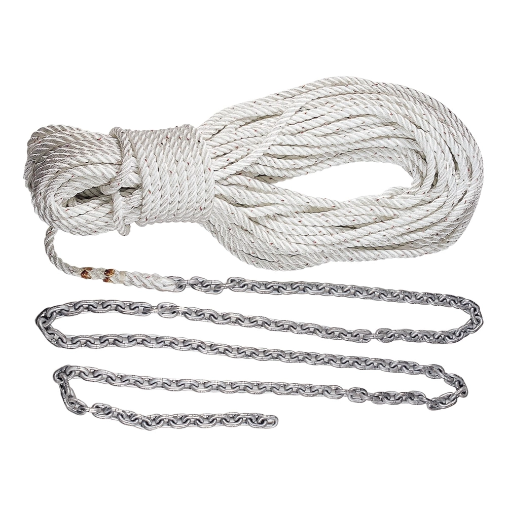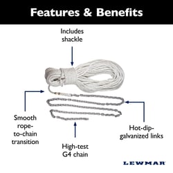 The Lewmar 2020202592 pre-spliced anchor rode provides a dependable connection between your windlass and anchor for reliable anchoring in all conditions. This complete anchoring system features 150 feet of treated, windlass-grade 1/2-inch three-strand nylon rope professionally spliced to 10 feet of 1/4-inch hot-dip galvanized G4 high-test chain, with a 5/16-inch shackle included for anchor attachment.