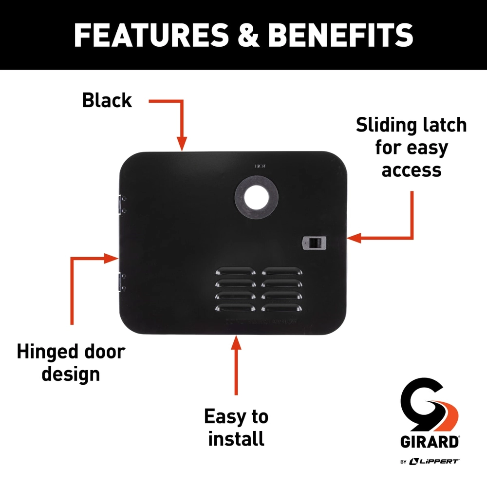 The Lippert Components Girard RV Water Heater Door Installation Kit provides a replacement door solution for Girard tankless water heaters installed in 6-gallon Atwood or Dometic water heater openings. This black door assembly features a hinged design with a sliding latch system that eliminates traditional twist latches, making access to your water heater components quick and convenient.
