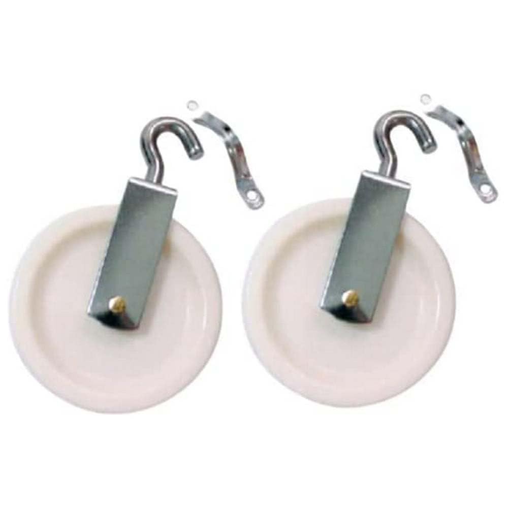 The Seachoice SC50-28501 Tiller Rope Pulley set is designed for marine tiller rope steering systems. This kit includes a pair of durable stainless steel and plastic pulleys, each equipped with stamped stainless steel eye straps for secure mounting.