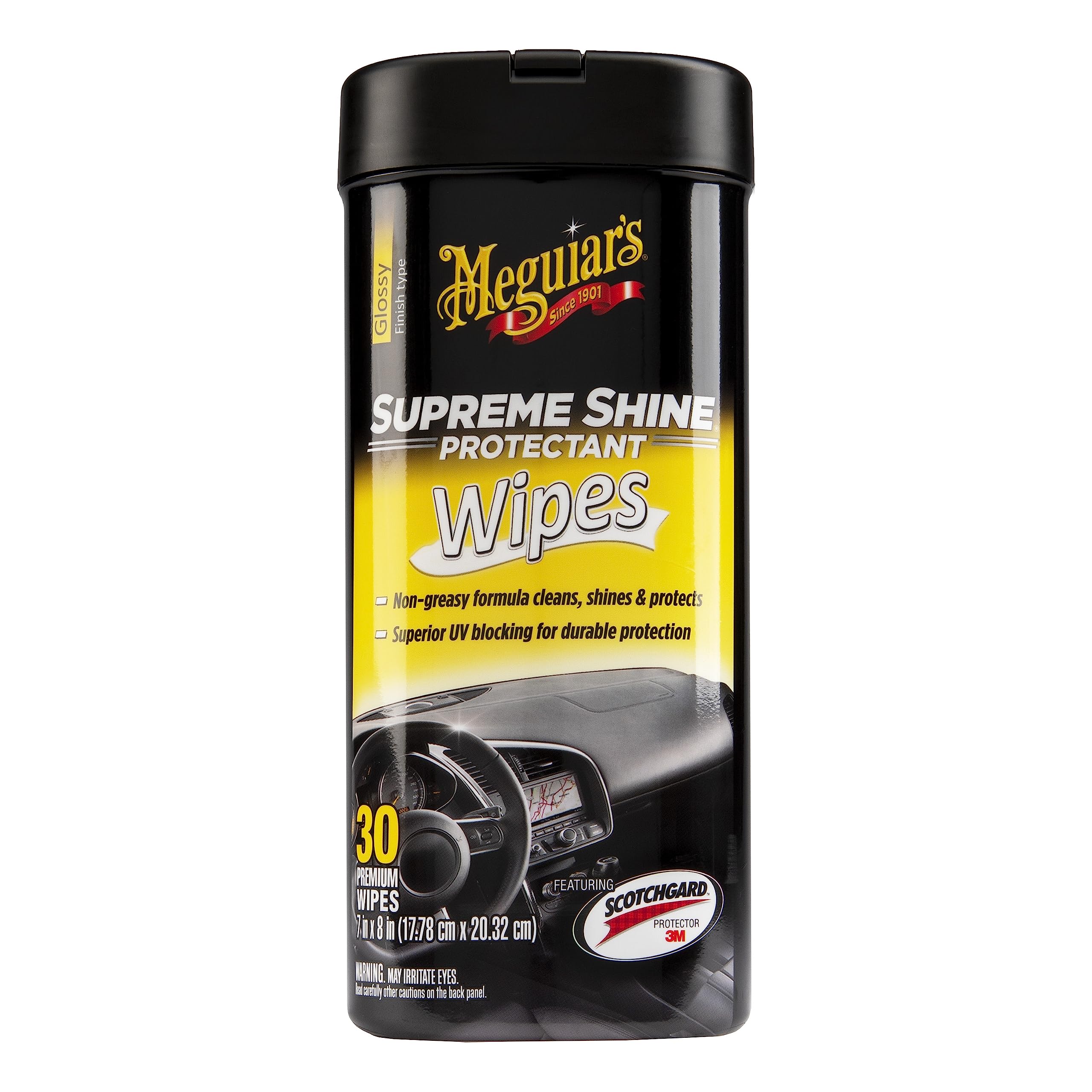 Meguiar's Supreme Shine Protectant Wipes combine premium cleaning power with advanced UV protection in a convenient, ready-to-use format. Each canister contains 25 large, non-linting wipes that clean, shine, and protect vinyl, rubber, and plastic surfaces throughout your vehicle's interior and exterior.