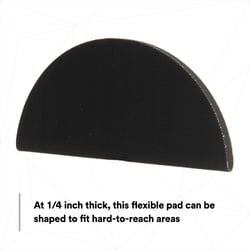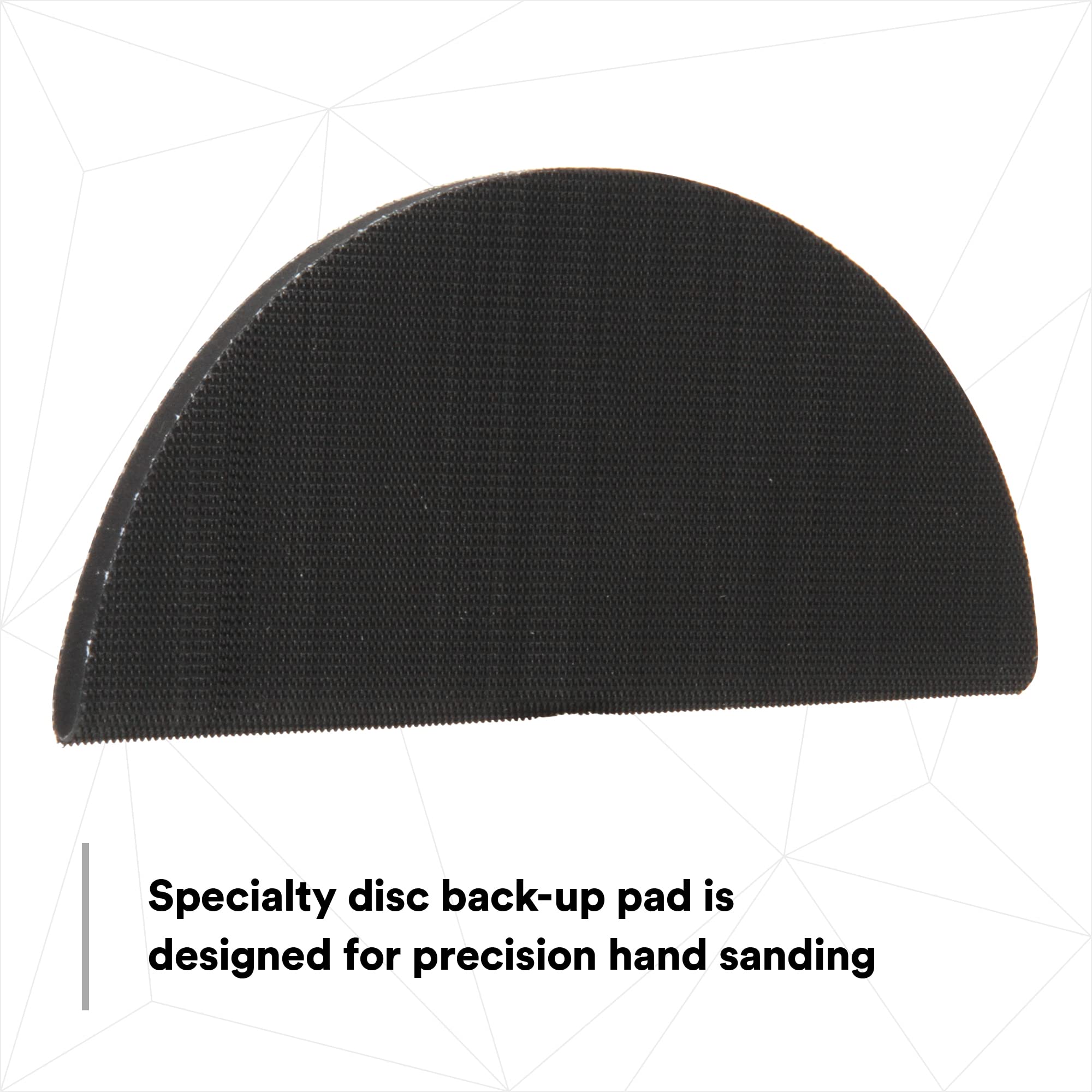 The 3M Hookit Half Round Disc Pad is a specialty hand sanding tool designed for hard-to-reach areas where standard round pads cannot effectively operate. This innovative pad allows technicians to wrap a 6-inch diameter 3M Hookit abrasive disc around its unique half-round shape, providing both straight and curved sanding edges.