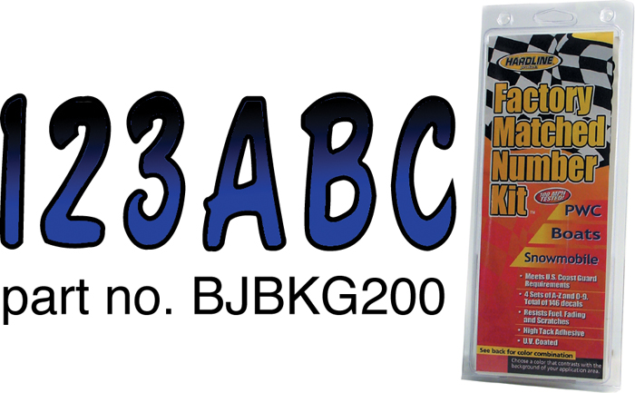 The Hardline Products SIBKG200 Series 200 Registration Kit provides a complete solution for displaying legally compliant registration numbers on boats, PWCs, and snowmobiles. This comprehensive kit features elegant cursive font lettering with eye-catching top-to-bottom color gradations that add a custom look to your watercraft or snowmobile.