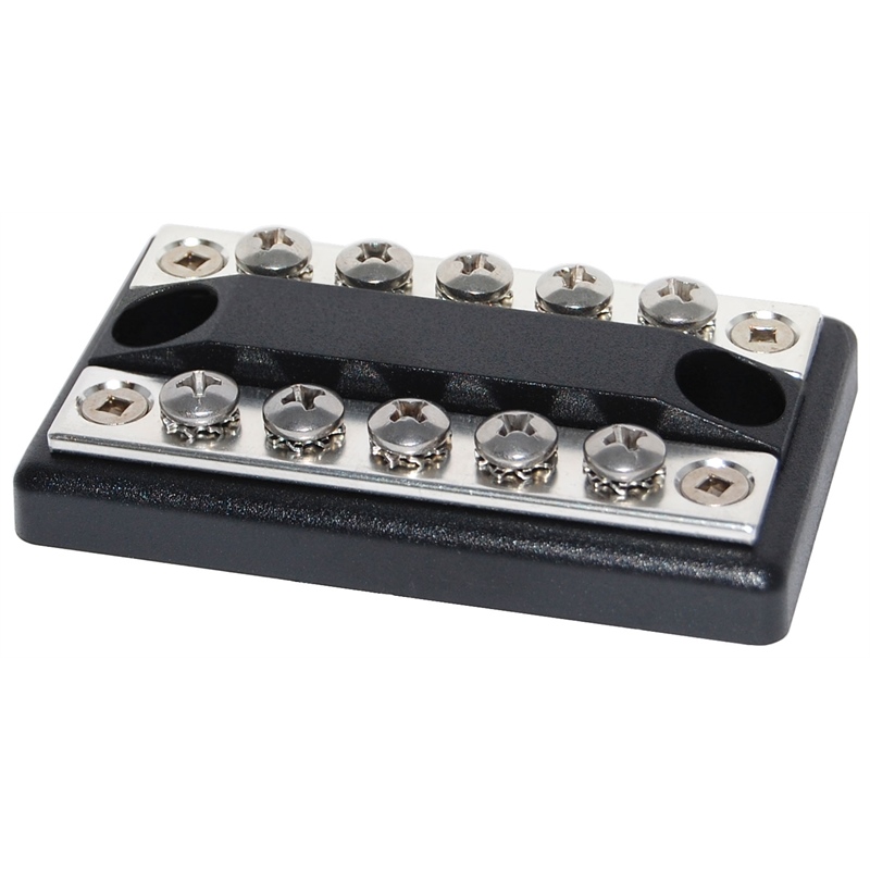 The Blue Sea Systems 2701 DualBus combines both positive and negative distribution onto a single, space-saving terminal block. This dual common busbar features five 8-32 screw terminals and is rated for 100 amperes, making it ideal for organizing DC electrical systems in marine, RV, and automotive applications.