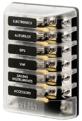 Blue Sea Systems has added some helpful features to ST glass fuse blocks. The insulating cover adds space to accept easy to read labels and satisfies ABYC and USCG requirements for insulation. Spare fuses store neatly in the cover. Fuses are spaced in a manner to make them easier to remove and install. Available with or without a ground bus to match the application. Corrosion resistant tin-plated copper buses and phosphor bronze fuse clips are made for marine applications will provide years of service.