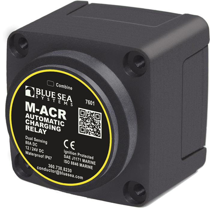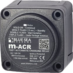 The Blue Sea Systems M-ACR (Mini Automatic Charging Relay) is designed specifically for boats with outboard engines and small inboard engines equipped with 65 amp or less alternators. This intelligent relay automatically manages dual battery systems, making it ideal when adding a second battery to support larger stereos, trolling motors, fishfinders, or other marine electronics.