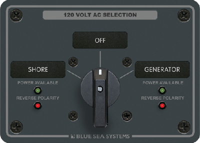 The Blue Sea Systems 8367 AC Rotary Switch Panel provides reliable switching between two 120-volt AC power sources with a convenient OFF position. This professionally engineered panel is built for marine and RV applications where durability and safety are paramount.