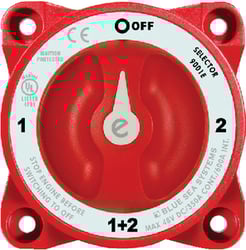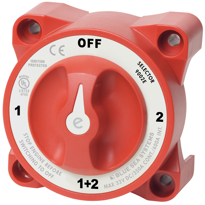 The Blue Sea Systems 9002E e-Series Battery Switch is a professional-grade 4-position selector switch designed for marine electrical systems. This switch allows you to manage isolated battery banks, switching them to all loads or combining them to power your vessel's electrical system without interruption.