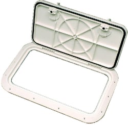 The Bomar G81020W is a flush-mounting, low-profile molded hatch designed for marine applications. Measuring 10 x 20 inches, this white hatch features a fully gasketed construction made from UV-stabilized resin to withstand harsh marine environments and prolonged sun exposure.