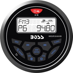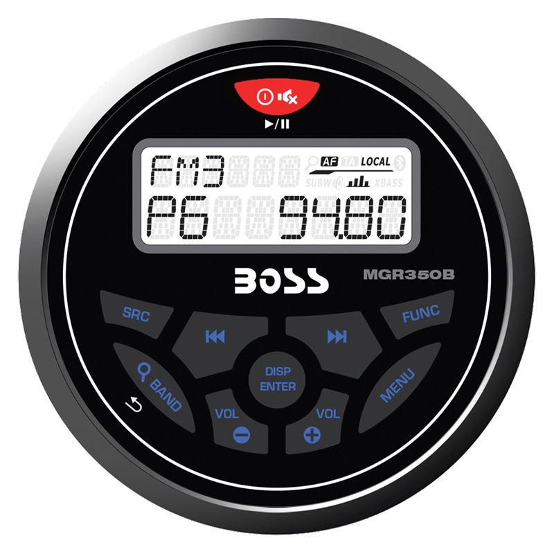 The Boss Audio Systems MGR350B is a weatherproof mechless marine stereo receiver designed for boats, UTVs, and powersports vehicles. This compact in-dash unit delivers reliable entertainment without the complexity of a CD mechanism, featuring Bluetooth connectivity, USB playback, and AM/FM radio with RDS tuning.