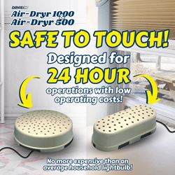 Simply place the Air-Dryr 1000 on the floor of any damp, enclosed area such as a boat cabin, RV interior, basement, closet, or storage locker, and plug it in. The unit works by gently warming the air to reduce relative humidity, preventing the growth of mold and mildew while protecting your valuable equipment and furnishings from moisture damage.