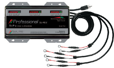The Dual Pro PS3 Professional Series is a waterproof marine smart battery charger featuring three independent 15-amp banks for a total output of 45 amps. This microprocessor-controlled charger offers PROVolt Intuitive charging technology that provides a fuller battery charge, giving you more runtime. Made in the USA and approved for wet cell and AGM batteries, this charger is fully automatic, overcharge protected, temperature compensating, ignition protected, and USCG-approved.