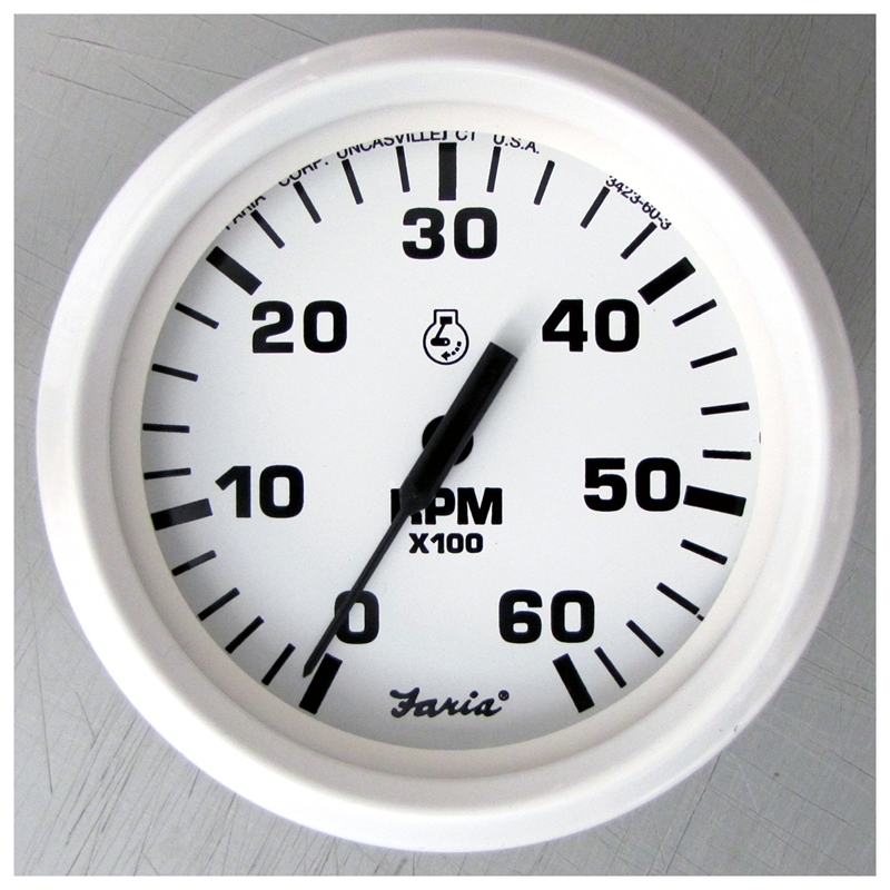 The Faria Instruments Dress White 4" Tachometer is designed for gasoline-powered inboard and sterndrive (I/O) engines with a maximum reading of 6000 RPM. This analog gauge features a perimeter-lighted white dial with bold black graphics, a white aluminum bezel, a contoured black pointer, and a flat anti-scratch glass lens for durability and easy visibility in marine environments.