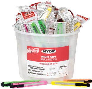 The Hyde Tools 49697 is a convenient counter display bucket containing 25 assorted color 18mm snap-off blade utility knives. This retail-ready display solution is perfect for hardware stores, paint shops, and tool retailers looking to offer quality cutting tools in an attractive point-of-purchase format.