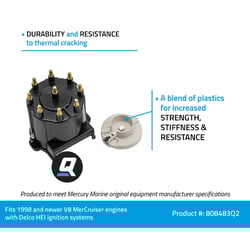 The Quicksilver 808483Q 2 Distributor Cap Kit is engineered specifically for marinized V8 engines by General Motors equipped with Delco HEI (High Energy Ignition) systems. This genuine OEM replacement part fits 1998 and newer MerCruiser engines, delivering reliable ignition performance in demanding marine environments.